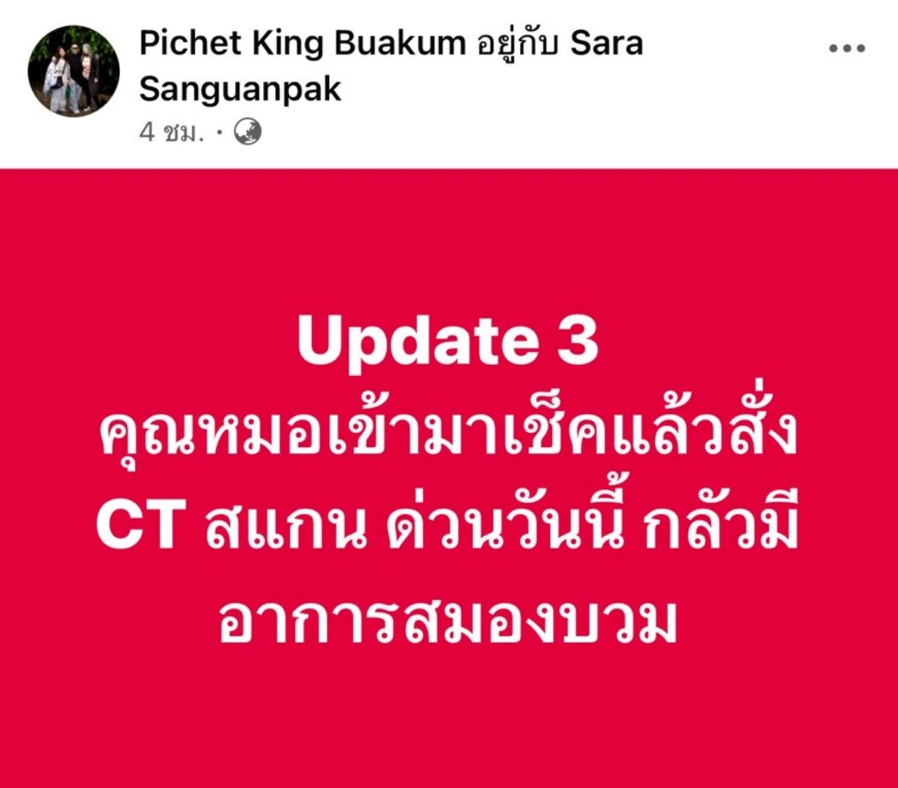 และล่าสุด คุณงู ภรรยาของ คิง เดอะวอยซ์ ก็ได้อัพเดทอาการของสามีอีกครั้งว่า "Update 3 คุณหมอเข้ามาเช็คแล้วสั่ง CT สแกน ด่วนวันนี้ กลัวมีอาการสมองบวม"