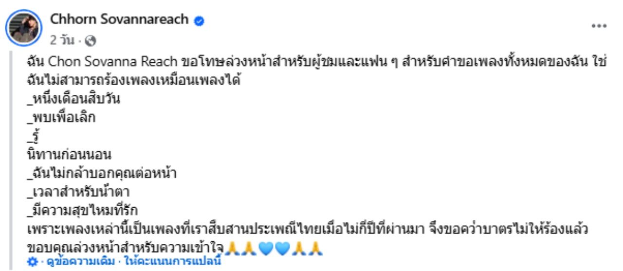 มีรายงานว่า "โชน โสวานเรียช" (Chhorn SovannaReach) นักร้องหนุ่มชื่อดังและยังเป็นเมนเทอร์ชาวกัมพูชา จากรายการ Cambodian Idol และ The Voice Cambodia ได้ออกมาประกาศเลิกร้องเพลงของตัวเองจำนวน 7 เพลง ที่ได้รับแรงบันดาลใจมาจากเพลงไทย และใช้หากินมานานหลายปี