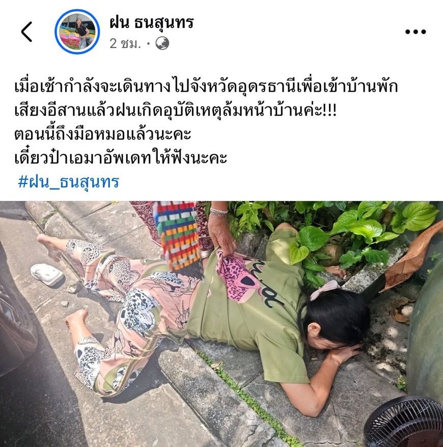 ทำเอาแฟนๆ ต่างเป็นห่วง หลังเห็นภาพของ ฝน ธนสุนทร ที่เกิดอุบัติเหตุล้มหน้าคว่ำอยู่หน้าบ้าน พร้อมระบุข้อความว่า "เมื่อเช้ากำลังจะเดินทางไปจังหวัดอุดรธานีเพื่อเข้าบ้านพักเสียงอีสานแล้วฝนเกิดอุบัติเหตุล้มหน้าบ้านค่ะ!!! ตอนนี้ถึงมือหมอแล้วนะคะ เดี๋ยวป๋าเอมาอัปเดตให้ฟังนะคะ #ฝน_ธนสุนทร"