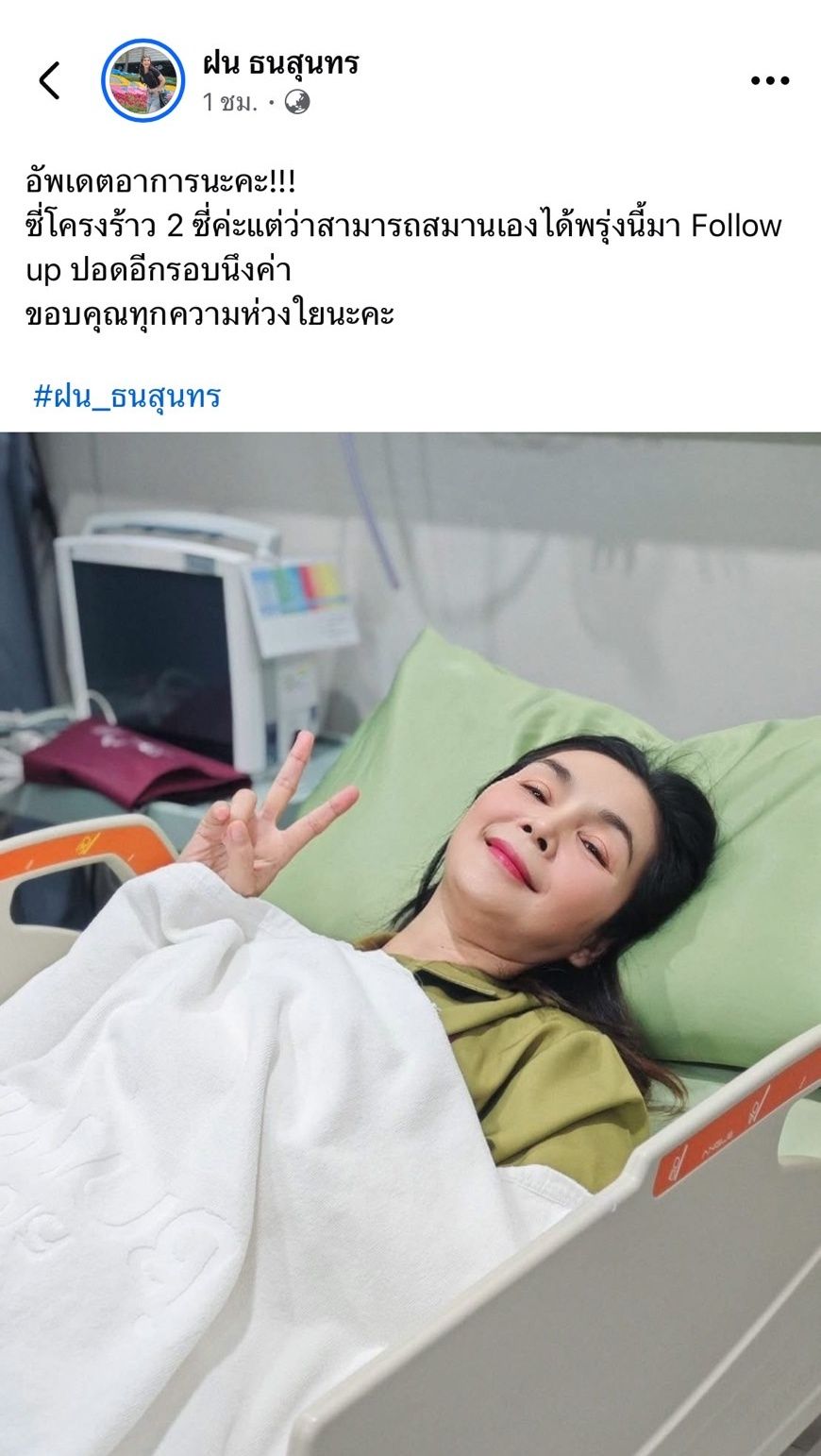 ซึ่ง ฝน ได้ถึงมือหมอเรียบร้อยแล้ว พร้อมอัปเดตอาการว่า "อัปเดตอาการนะคะ!!!ซี่โครงร้าว 2 ซี่ค่ะ แต่ว่าสามารถสมานเองได้พรุ่งนี้มา Follow up ปอดอีกรอบนึงค่า ขอบคุณทุกความห่วงใยนะคะ #ฝน_ธนสุนทร"