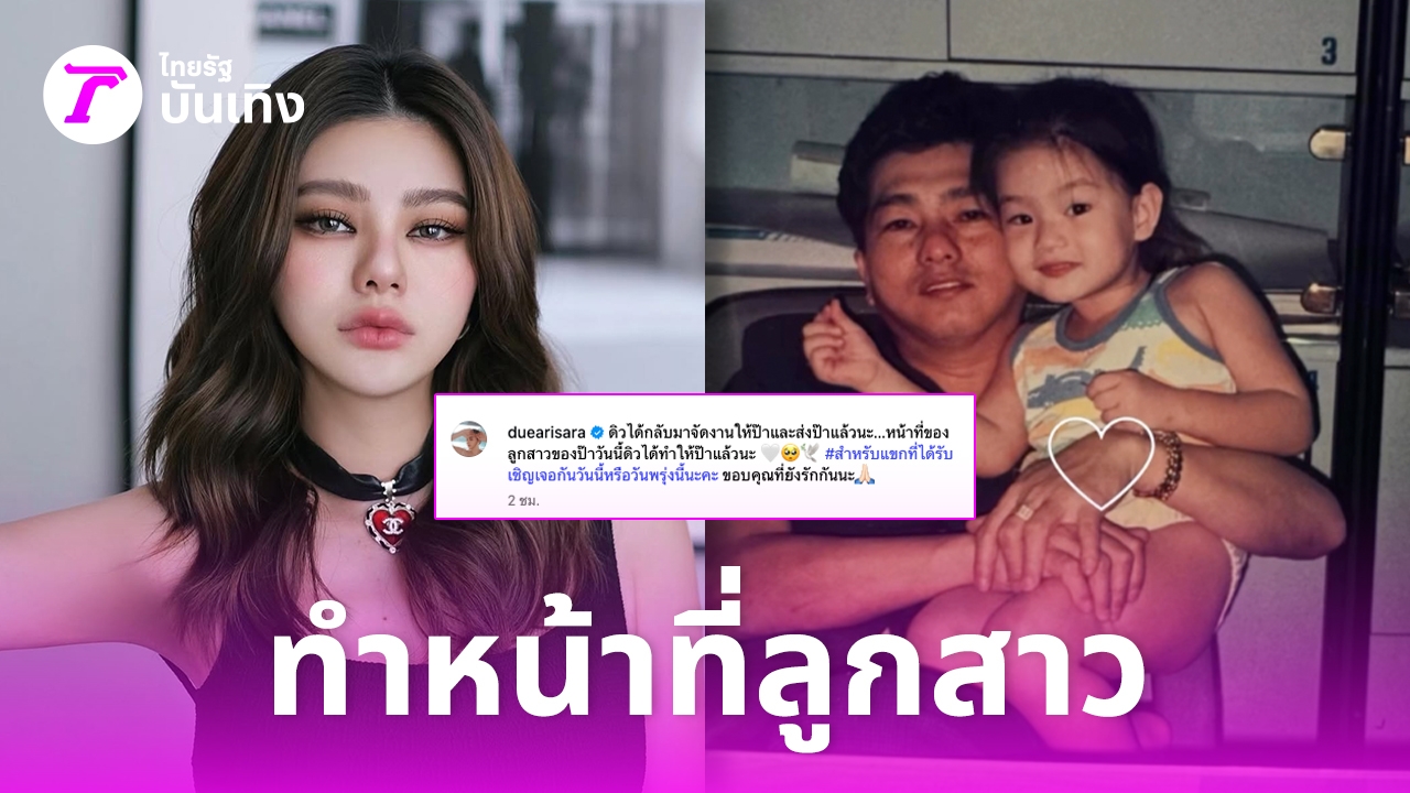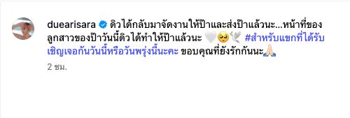 "ดิวได้กลับมาจัดงานให้ป๊าและส่งป๊าแล้วนะ...หน้าที่ของลูกสาวของป๊าวันนี้ดิวได้ทำให้ป๊าแล้วนะ #สำหรับแขกที่ได้รับเชิญเจอกันวันนี้หรือวันพรุ่งนี้นะคะ ขอบคุณที่ยังรักกันนะ"
