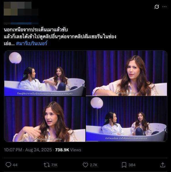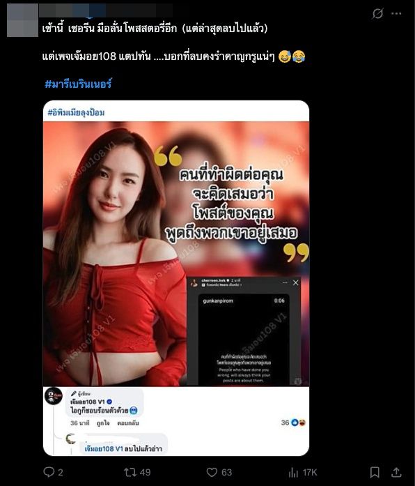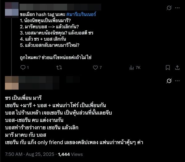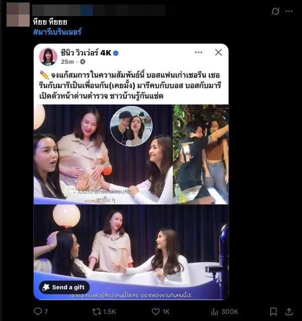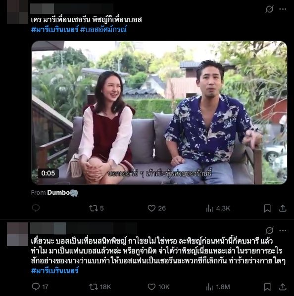 งานนี้ทำเอาโลกโซเชียลวิจารณ์อย่างหนักถึงพฤติกรรมของทั้งคู่ จนแฮชแท็ก #มารีเบรินเนอร์ ติดเทรนด์ทวิตเตอร์ (X) และเมื่อเข้าไปส่องแท็กดังกล่าว นอกจากจะมีคนพูดถึงเรื่องราวที่เกิดขึ้นแล้ว ยังหยิบยกเรื่องความสัมพันธ์ของ มารี-บอส มาพูดถึงและไล่ไทม์ไลน์ช่วงที่ทั้งคู่คบกันด้วย บ้างก็วิจารณ์ว่ามารีก็เป็นเพื่อนกับนักร้องนักแสดงสาว เชอรีน ณัฐจารี หรเวชกุล อดีตภรรยาของบอส อัศม์กรณ์ แต่ทำไมถึงมาคบกับบอสซึ่งเป็นสามีเก่าของเพื่อน