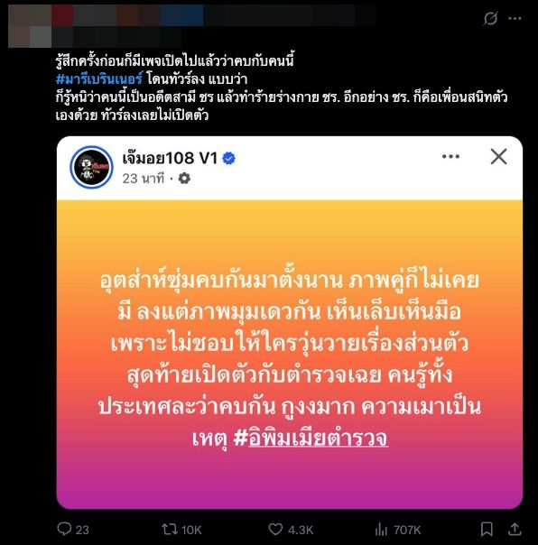 หลังจากที่นักแสดงสาว มารี เบรินเนอร์ ขับรถหรูเข้าด่าน แต่ไม่ยอมตรวจวัดแอลกอฮอล์ ทำให้ถูกตั้งข้อหาเมาแล้วขับ ในขณะที่หวานใจหนุ่มอย่างนักธุรกิจ บอส อัศม์กรณ์ สิงห์สีกรกุล ด่ากราดและขัดขวางการทำงานของเจ้าหน้าที่ตำรวจ และถูกตั้งข้อหามีพฤติกรรมดูหมิ่นและขัดขวางเจ้าพนักงานในขณะปฏิบัติหน้าที่