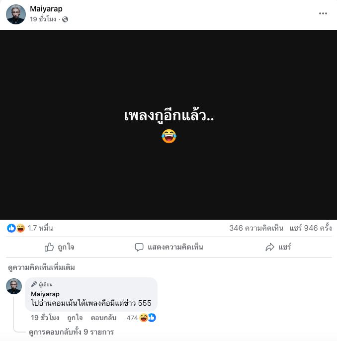 ในขณะที่ MAIYARAP ก็ได้โพสต์ข้อความลงในแฟนเพจแบบสั้นๆ ว่า “เพลงกูอีกแล้ว..” และใส่อีโมจิขำน้ำตาไหล ก่อนจะคอมเมนต์เพิ่มเติมใต้โพสต์ว่า “ไปอ่านคอมเมนต์ใต้เพลงคือมีแต่ข่าว 555”