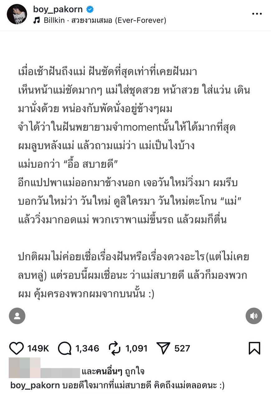 พร้อมทั้งเขียนแคปชั่นว่า “บอยดีใจมากที่แม่สบายดี คิดถึงแม่ตลอดนะ :)” ท่ามกลางคอมเมนต์จากคนในวงการและแฟนๆ ที่ต่างส่งกำลังใจให้เป็นจำนวนมาก