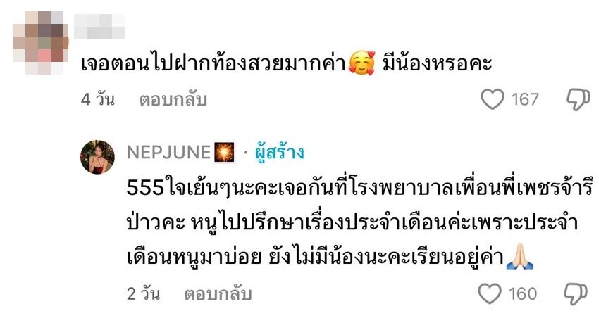 งานนี้ทำเอาน้องเนปจูนรีบเคลียร์ทันทีแบบชัดเจน โดยบอกว่า “555 ใจเย็นๆ นะคะ เจอกันที่โรงพยาบาลเพื่อนพี่เพชรจ้ารึป่าวคะ หนูไปปรึกษาเรื่องประจำเดือนค่ะ เพราะประจำเดือนหนูมาบ่อย ยังไม่มีน้องนะคะ เรียนอยู่ค่า”