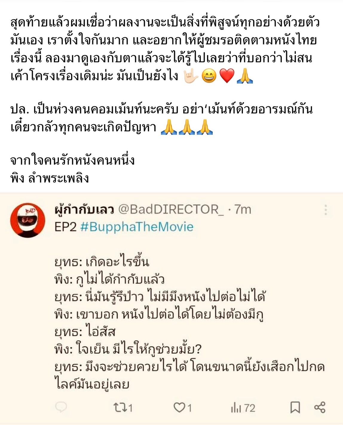 ขอยืนยันเลยว่า ผมเริ่มต้นโครงการนี้มาด้วยการเป็นผู้กำกับ และยังทำหน้าที่ในฐานะผู้กำกับมาตลอด ผมและปอนด์เราทำงานกันเป็นทีม หนังเรื่องนี้ถ่ายทำทั้งหมด 22 คิว มี “พิง ลำพระเพลิง” เข้ากองกำกับไปแล้ว 12 คิว เมื่อวานก็อยู่กอง วันนี้ถ่ายวันสุดท้าย ผมก็ยังทำหน้าที่ “ผู้กำกับ” อยู่จนวินาทีสุดท้ายที่ปิดกล้อง