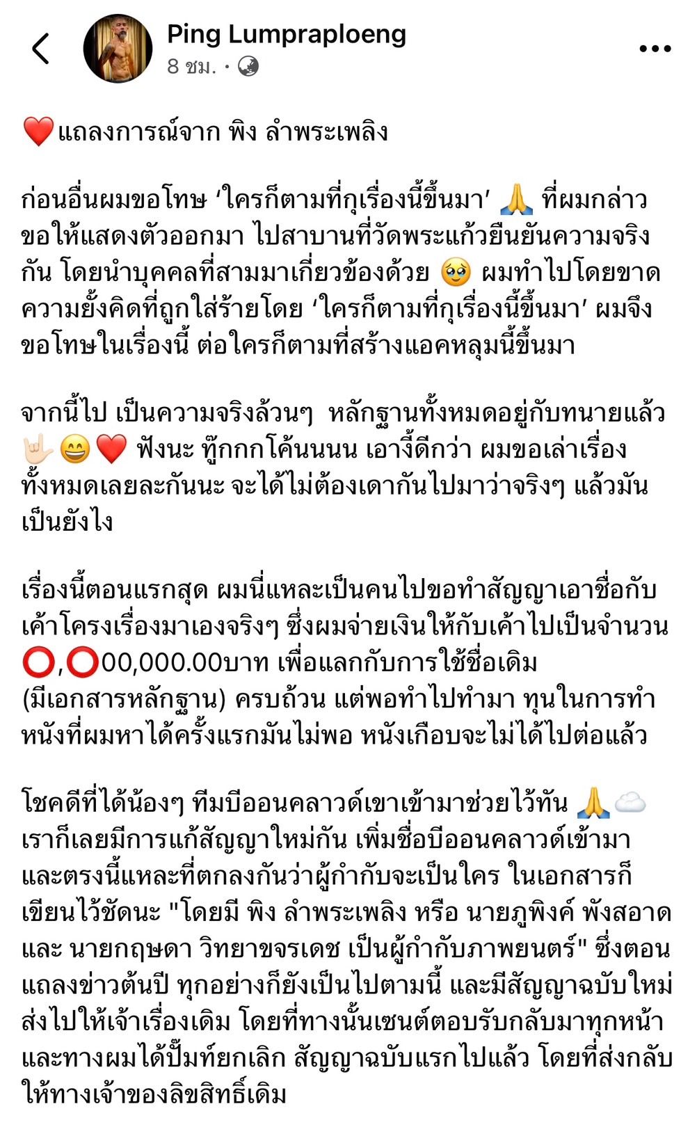 แต่ล่าสุด พิง ลำพระเพลิง ก็ได้ออกมาโพสต์ข้อความเพื่อชี้แจงรายละเอียดในเรื่องนี้แบบยาวเหยียดเอาไว้ในเฟซบุ๊กของตัวเอง โดยมีข้อความว่า