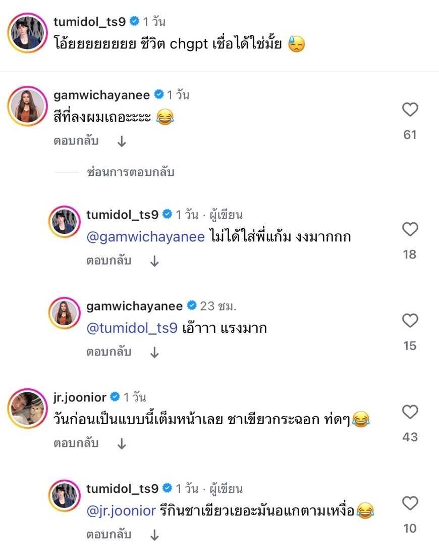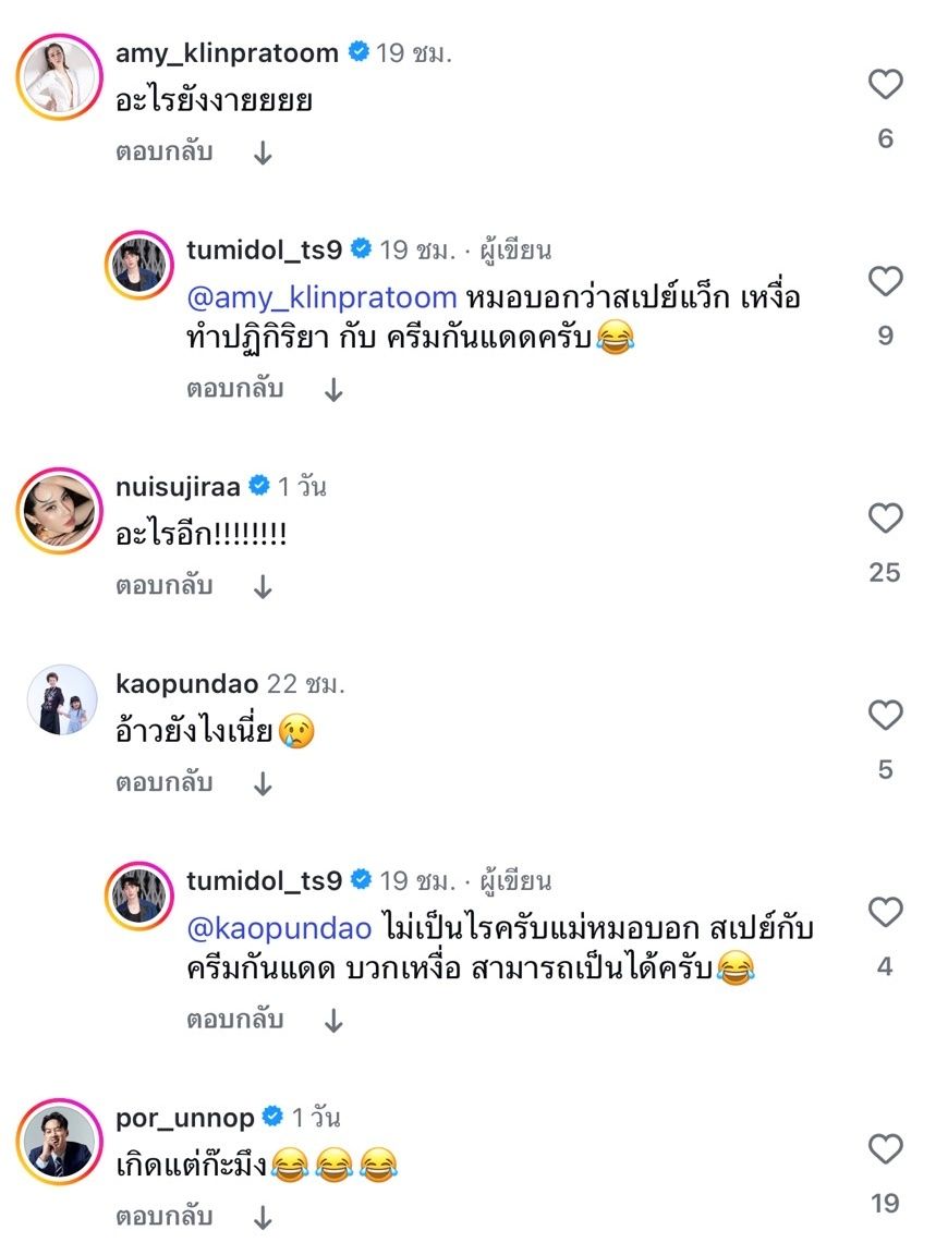 งานนี้ทำเอาคนในวงการต่างคอมเมนต์รัวๆ ด้านแก้ม วิชญาณี บอกว่า “สีที่ลงผมเถอะะะะ” แต่ตั้มตอบกลับว่า “ไม่ได้ใส่พี่แก้ม งงมากกก” ส่วนคนอื่นๆ ก็คอมเมนต์ อาทิ ปอ อรรณพ “เกิดแต่ก๊ะมึง”, เอมี่ กลิ่นประทุม “อะไรยังงายยยย”, ซี ศิวัฒน์ “โอยยยย อะไรอีกกกอีหนู”, ดวงดาว จารุจินดา “อ้าวยังไงเนี่ย”, นุ้ย สุจิรา “อะไรอีก!!!!!!!!” ฯลฯ ก่อนที่ตั้มจะตอบกลับว่า “หมอบอกว่าสเปรย์แว็กซ์ เหงื่อ ทำปฏิกิริยากับครีมกันแดดครับ”
