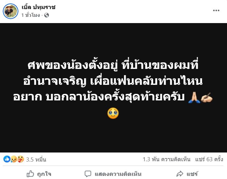 หลังจากนั้น เบิ้ล ปทุมราช โพสต์ข้อความเพิ่มเติม ระบุว่า “ขอบคุณ ทาง รายการ และละครที่เข้าใจผม คืนนี้ผมร้องเพลงเสร็จผมต้องกลับบ้านทำหน้าพี่ชายครั้งสุดท้ายให้น้องผม ใจผมสลายครับ แต่จะทำหน้าที่คอนเสิร์ต คืนนี้ให้ดีที่สุด” พร้อมทั้งเผยถึงพิธีศพของน้องจ๊อด โดยบอกว่า “ศพของน้องตั้งอยู่ ที่บ้านของผมที่อำนาจเจริญ เผื่อแฟนคลับท่านไหนอยาก บอกลาน้องครั้งสุดท้ายครับ”