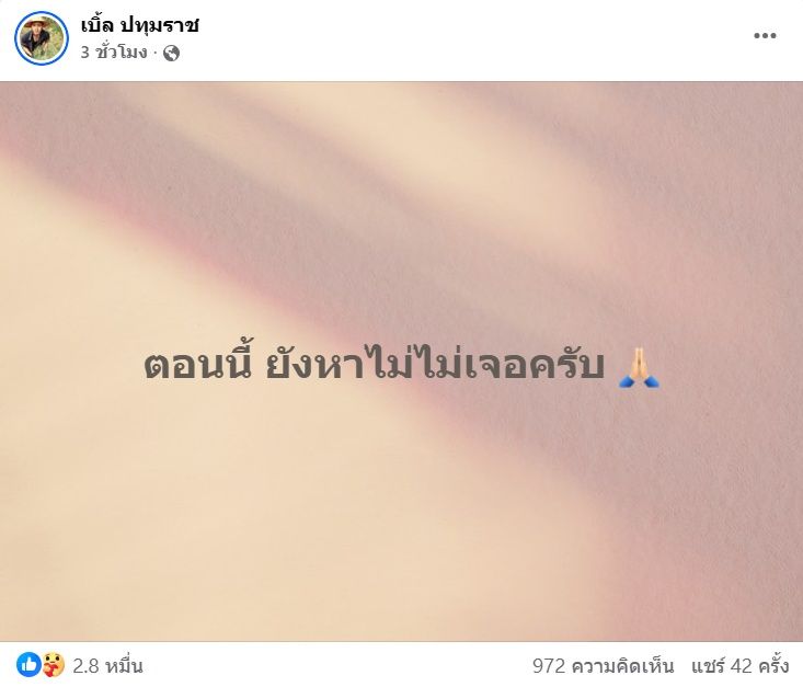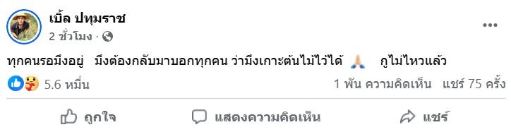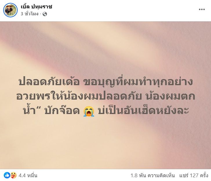 โดยก่อนหน้านี้ เบิ้ล ปทุมราช โพสต์แจ้งข่าวว่าน้องจ๊อดตกน้ำ โดยบอกว่า “ปลอดภัยเด้อ ขอบุญที่ผมทำทุกอย่าง อวยพรให้น้องผมปลอดภัย น้องผมตกน้ำ บักจ๊อด บ่เป็นอันเฮ็ดหยังละ” ก่อนจะโพสต์เพิ่มเติมว่า “ตอนนี้ยังหาไม่เจอครับ” รวมถึงข้อความ “ทุกคนรอมึงอยู่ มึงต้องกลับมาบอกทุกคน ว่ามึงเกาะต้นไม้ไว้ได้ กูไม่ไหวแล้ว”