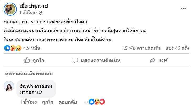 โดยมีแฟนๆ รวมถึงคนในวงการบันเทิงคอมเมนต์แสดงความเสียใจกับเบิ้ลเป็นจำนวนมาก ไทยรัฐบันเทิงขอแสดงความเสียใจด้วยนะคะ