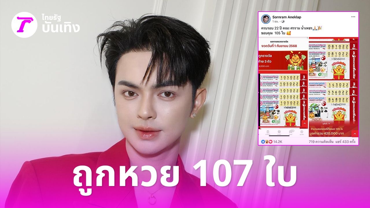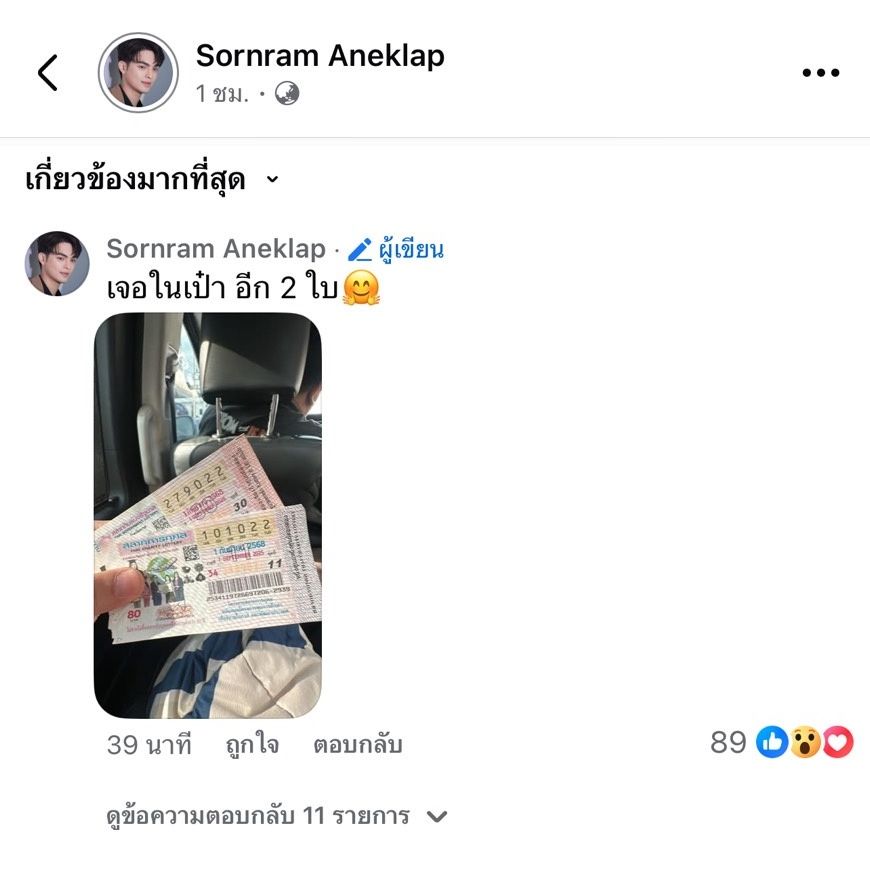 โดยในเฟซบุ๊ก Sornram Aneklap ได้โพสต์ภาพลอตเตอรี่ที่ถูกรางวัลเลขท้าย 3 ตัว 022 จำนวน 105 ใบ เป็นเงินกว่า 420,000 บาท พร้อมทั้งเขียนแคปชั่นว่า “ครบรอบ 22 ปี คณะ ศรราม น้ำเพชร ขอบคุณ 105 ใบ”