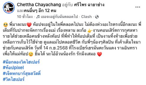 ก่อนจะโพสต์ภาพกำหนดการสวดพระอภิธรรมและฌาปนกิจของ ท็อป มือกลอง หรือ นายจักรกฤษณ์ ทองอยู่เลิศ ซึ่งจัดขึ้น ณ วัดม่วง บางแค เพชรเกษม 63 ศาลา 2 ตั้งแต่วันที่ 1-5 กันยายน 2568 และมีพิธีฌาปนกิจ วันที่ 6 กันยายน 2568