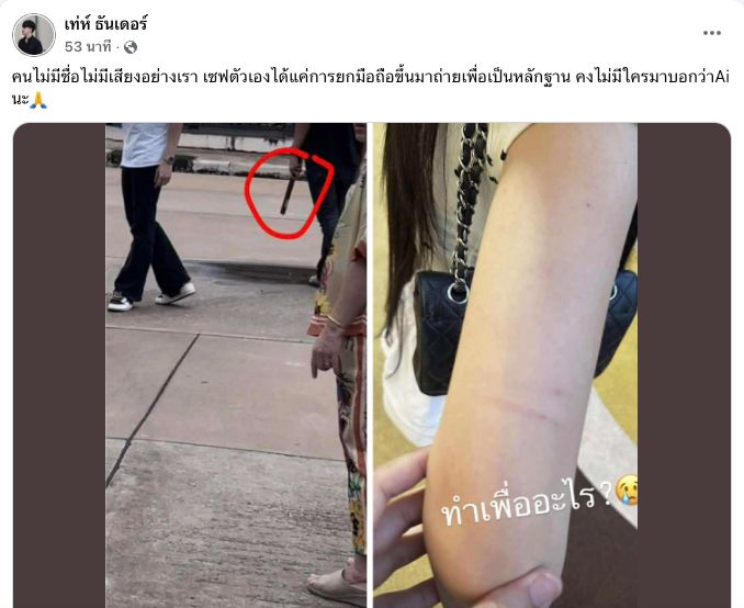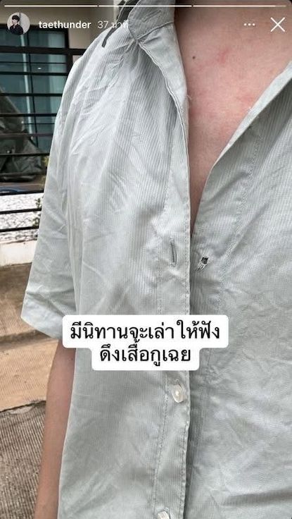 "คนไม่มีชื่อไม่มีเสียงอย่างเรา เซฟตัวเองได้แค่การยกมือถือขึ้นมาถ่ายเพื่อเป็นหลักฐาน คงไม่มีใครมาบอกว่าAI นะ" และโพสต์รูปลงในสตอรี่ เป็นรูปเสื้อที่กระดุมขาด พร้อมข้อความว่า "มีนิทานจะเล่าให้ฟัง ดึงเสื้อกูเฉย"