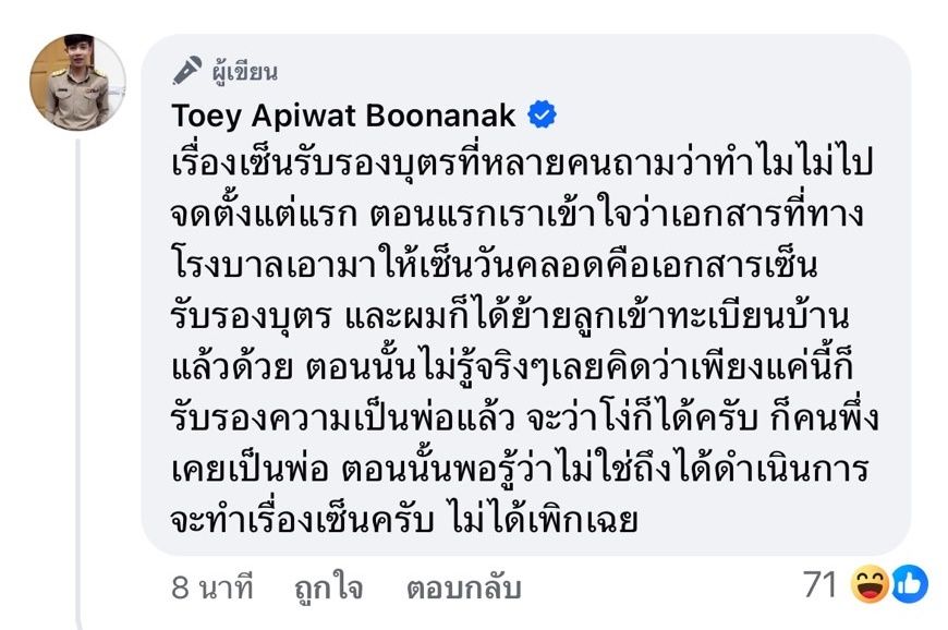 นอกจากนี้ เจ้าตัวยังได้เผยเหตุผลที่ไม่ได้รับรองบุตรตั้งแต่ลูกเกิดว่า "เรื่องเซ็นรับรองบุตรที่หลายคนถามว่าทำไมไม่ไปจดตั้งแต่แรก ตอนแรกเราเข้าใจว่าเอกสารที่ทางโรงพยาบาลเอามาให้เซ็นวันคลอดคือเอกสารเซ็นรับรองบุตร และผมก็ได้ย้ายลูกเข้าทะเบียนบ้านแล้วด้วย ตอนนั้นไม่รู้จริงๆเลยคิดว่าเพียงแค่นี้ก็รับรองความเป็นพ่อแล้ว จะว่าโง่ก็ได้ครับ ก็คนเพิ่งเคยเป็นพ่อ ตอนนั้นพอรู้ว่าไม่ใช่ถึงได้ดำเนินการจะทำเรื่องเซ็นครับ ไม่ได้เพิกเฉย"