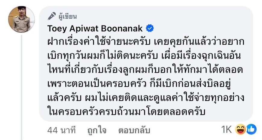 และยังพูดถึงเรื่องค่าใช้จ่ายของลูกอีกว่า "ฝากเรื่องค่าใช้จ่ายนะครับ เคยคุยกันแล้วว่าอยากเบิกทุกวันผมก็ไม่ติดนะครับ เผื่อมีเรื่องฉุกเฉินอันไหนที่เกี่ยวกับเรื่องลูกผมก็บอกให้ทักมาได้ตลอด เพราะตอนเป็นครอบครัว ก็มีเบิกก่อนส่งบิลอยู่แล้วครับ ผมไม่เคยติดและดูแลค่าใช้จ่ายทุกอย่างในครอบครัวครบถ้วนมาโดยตลอดครับ"