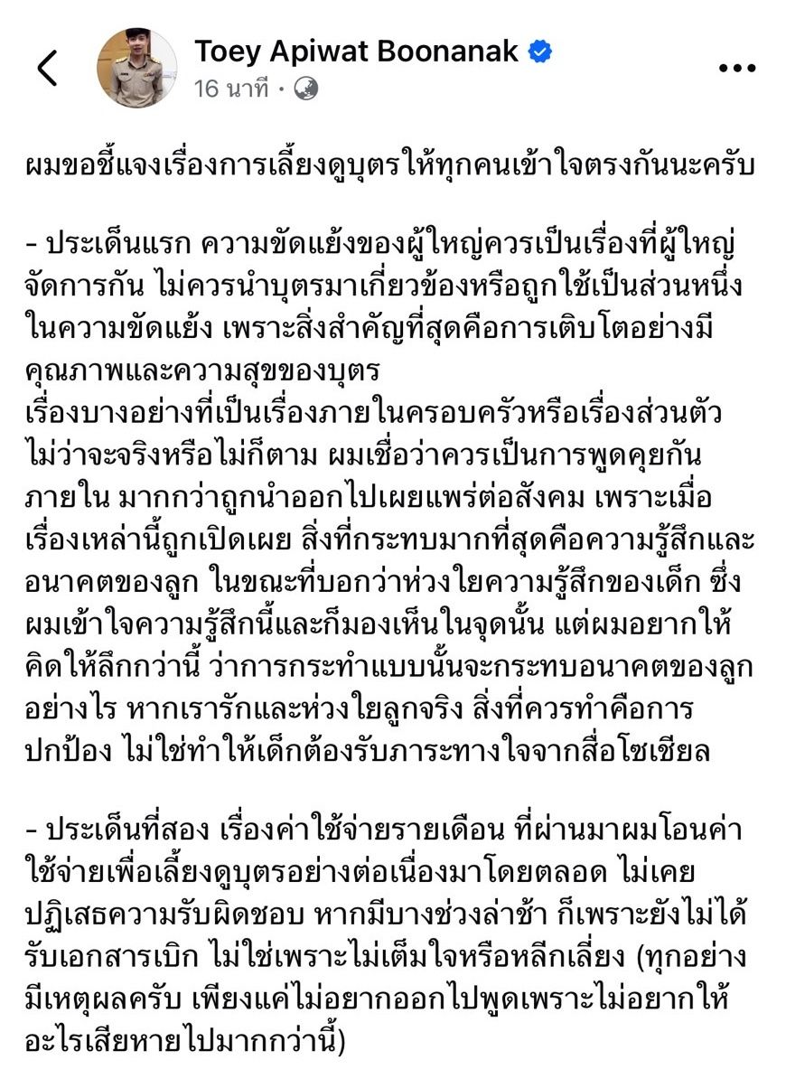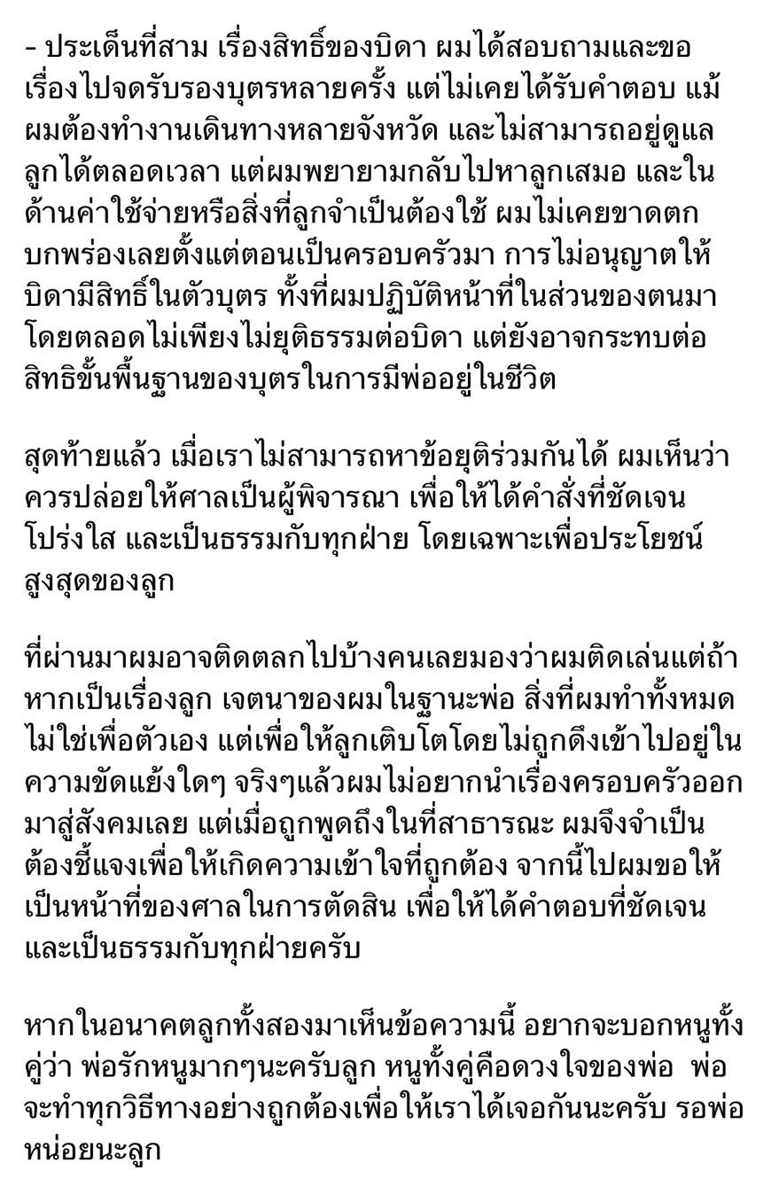 ที่ผ่านมาผมอาจติดตลกไปบ้าง คนเลยมองว่าผมติดเล่น แต่ถ้าหากเป็นเรื่องลูก เจตนาของผมในฐานะพ่อ สิ่งที่ผมทำทั้งหมดไม่ใช่เพื่อตัวเอง แต่เพื่อให้ลูกเติบโตโดยไม่ถูกดึงเข้าไปอยู่ในความขัดแย้งใดๆ จริงๆ แล้วผมไม่อยากนำเรื่องครอบครัวออกมาสู่สังคมเลย แต่เมื่อถูกพูดถึงในที่สาธารณะ ผมจึงจำเป็นต้องชี้แจงเพื่อให้เกิดความเข้าใจที่ถูกต้อง จากนี้ไปผมขอให้เป็นหน้าที่ของศาลในการตัดสิน เพื่อให้ได้คำตอบที่ชัดเจนและเป็นธรรมกับทุกฝ่ายครับ