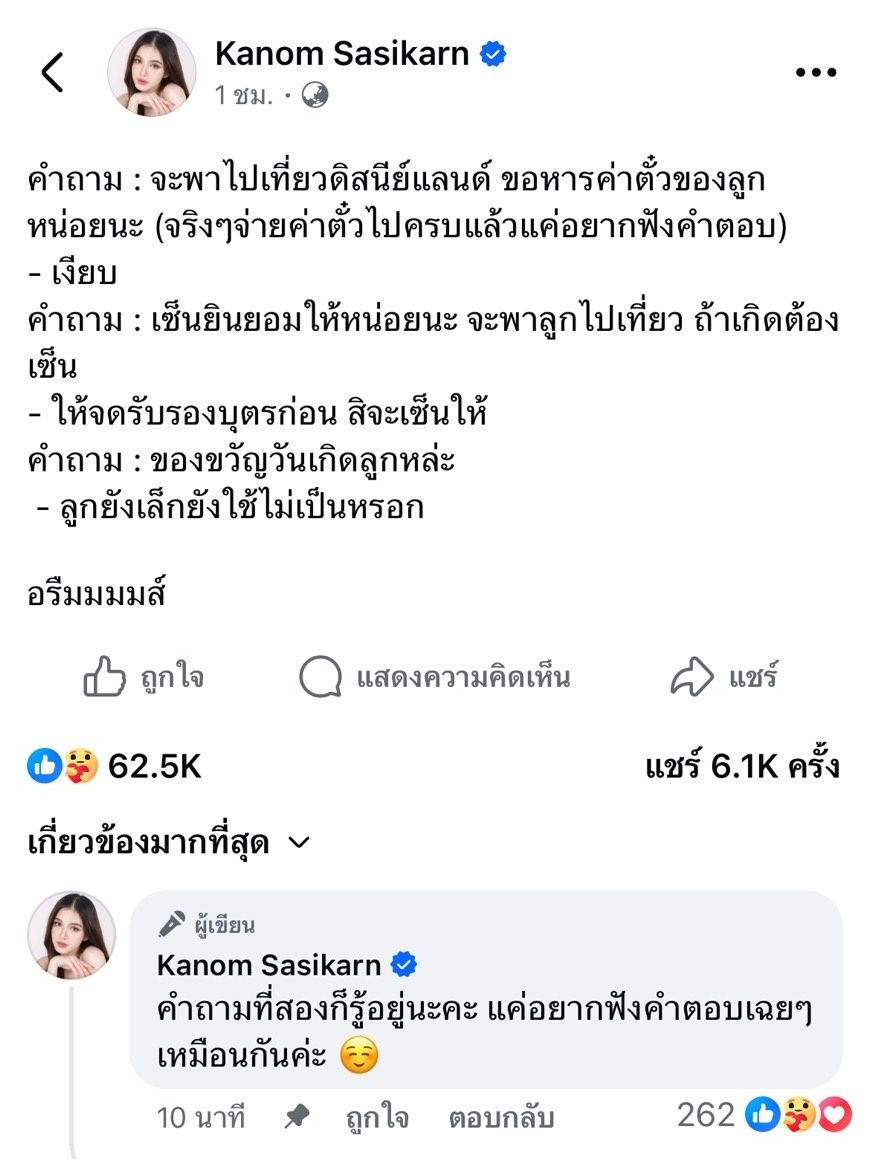 "คำถาม : จะพาไปเที่ยวดิสนีย์แลนด์ ขอหารค่าตั๋วของลูกหน่อยนะ (จริงๆจ่ายค่าตั๋วไปครบแล้วแค่อยากฟังคำตอบ) - เงียบ