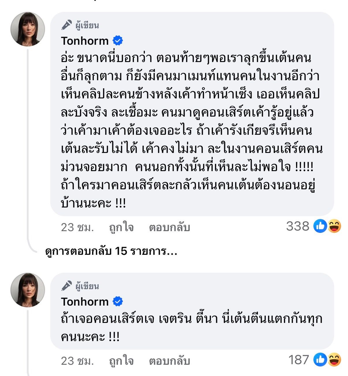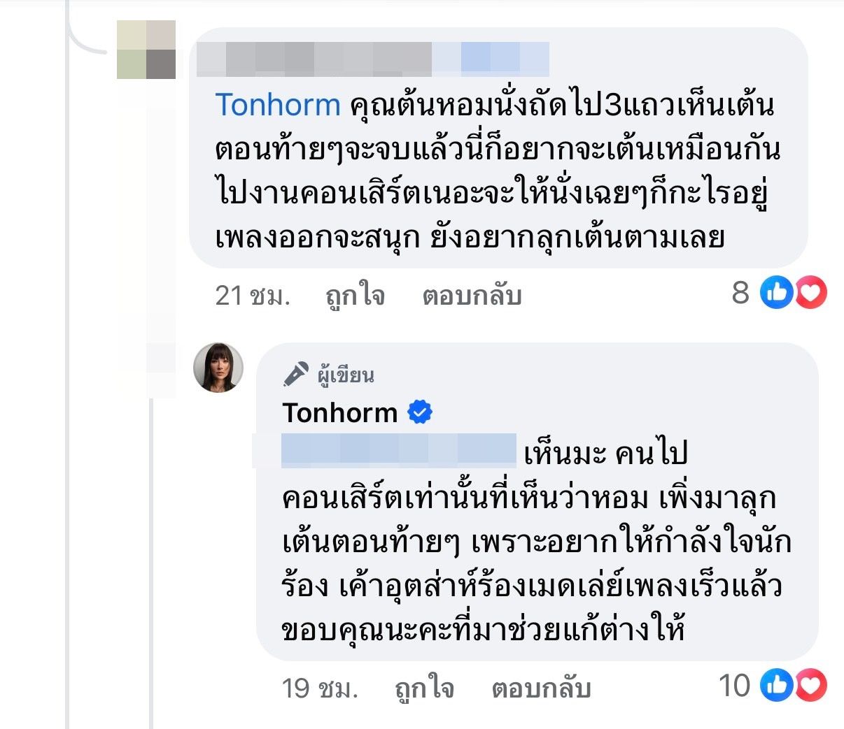 ซึ่งต้นหอมได้คอมเมนต์เพิ่มเติมในโพสต์ดังกล่าวว่า "อ่ะ ขนาดนี่บอกว่า ตอนท้ายๆ พอเราลุกขึ้นเต้นคนอื่นก็ลุกตาม ก็ยังมีคนมาเมนท์แทนคนในงานอีกว่า เห็นคลิปละคนข้างหลังเค้าทำหน้าเซ็ง เออเห็นคลิปละบังจริง ละเชื้อมะ คนมาดูคอนเสิร์ตเค้ารู้อยู่แล้วว่าเค้ามาเค้าต้องเจออะไร ถ้าเค้ารังเกียจรึเห็นคนเต้นละรับไม่ได้ เค้าคงไม่มา ละในงานคอนเสิร์ตคนม่วนจอยมาก คนนอกทั้งนั้นที่เห็นละไม่พอใจ !!!!! ถ้าใครมาคอนเสิร์ตละกลัวเห็นคนเต้นต้องนอนอยู่บ้านนะคะ !!!"