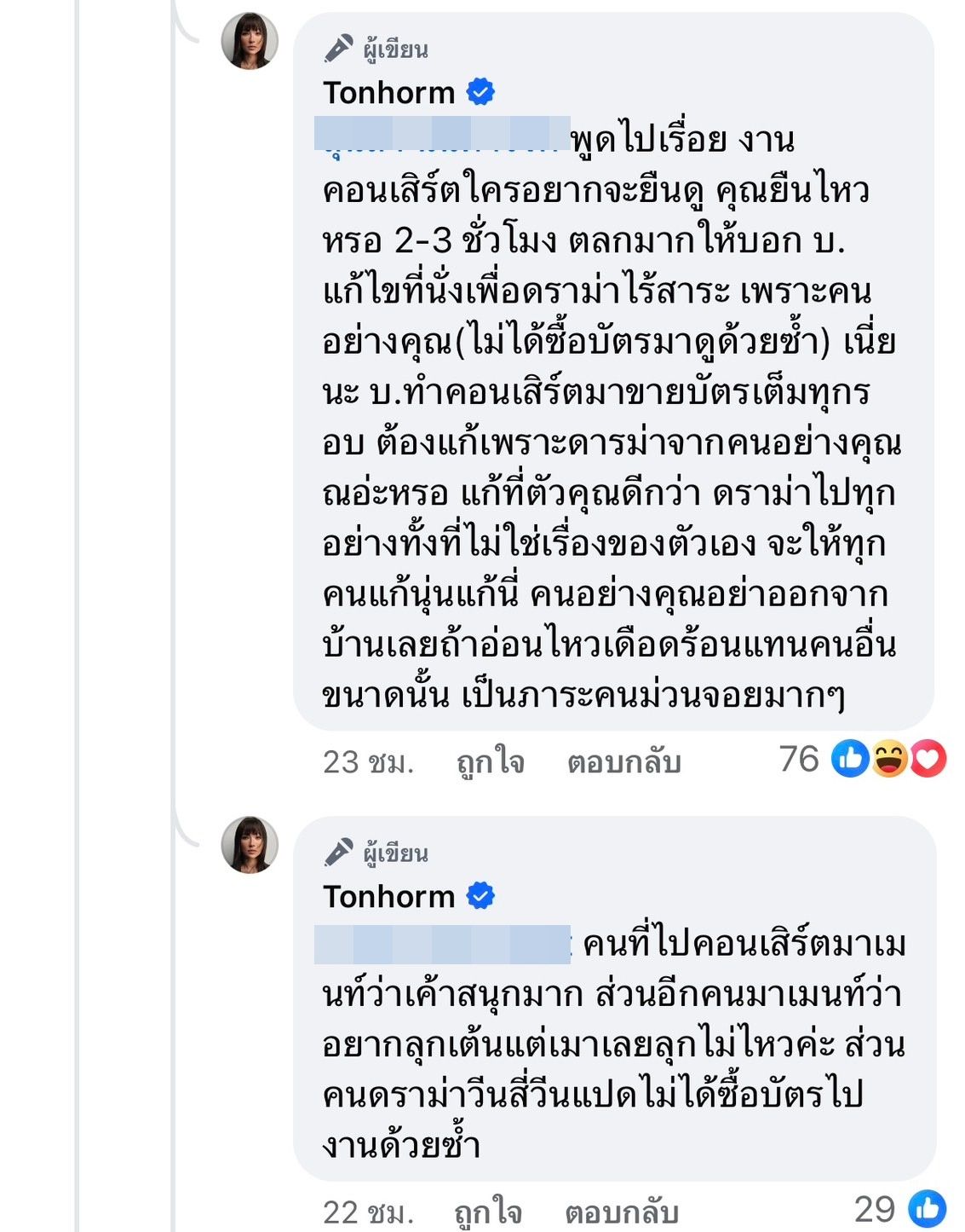 และ "พูดไปเรื่อย งานคอนเสิร์ตใครอยากจะยืนดู คุณยืนไหวหรอ 2-3 ชั่วโมง ตลกมากให้บอก บ. แก้ไขที่นั่งเพื่อดราม่าไร้สาระ เพราะคนอย่างคุณ (ไม่ได้ซื้อบัตรมาดูด้วยซ้ำ) เนี่ยนะ บ.ทำคอนเสิร์ตมาขายบัตรเต็มทุกรอบ ต้องแก้เพราะดารม่าจากคนอย่างคุณณอ่ะหรอ แก้ที่ตัวคุณดีกว่า ดราม่าไปทุกอย่างทั้งที่ไม่ใช่เรื่องของตัวเอง จะให้ทุกคนแก้นุ่นแก้นี่ คนอย่างคุณอย่าออกจากบ้านเลยถ้าอ่อนไหวเดือดร้อนแทนคนอื่นขนาดนั้น เป็นภาระคนม่วนจอยมากๆ"
