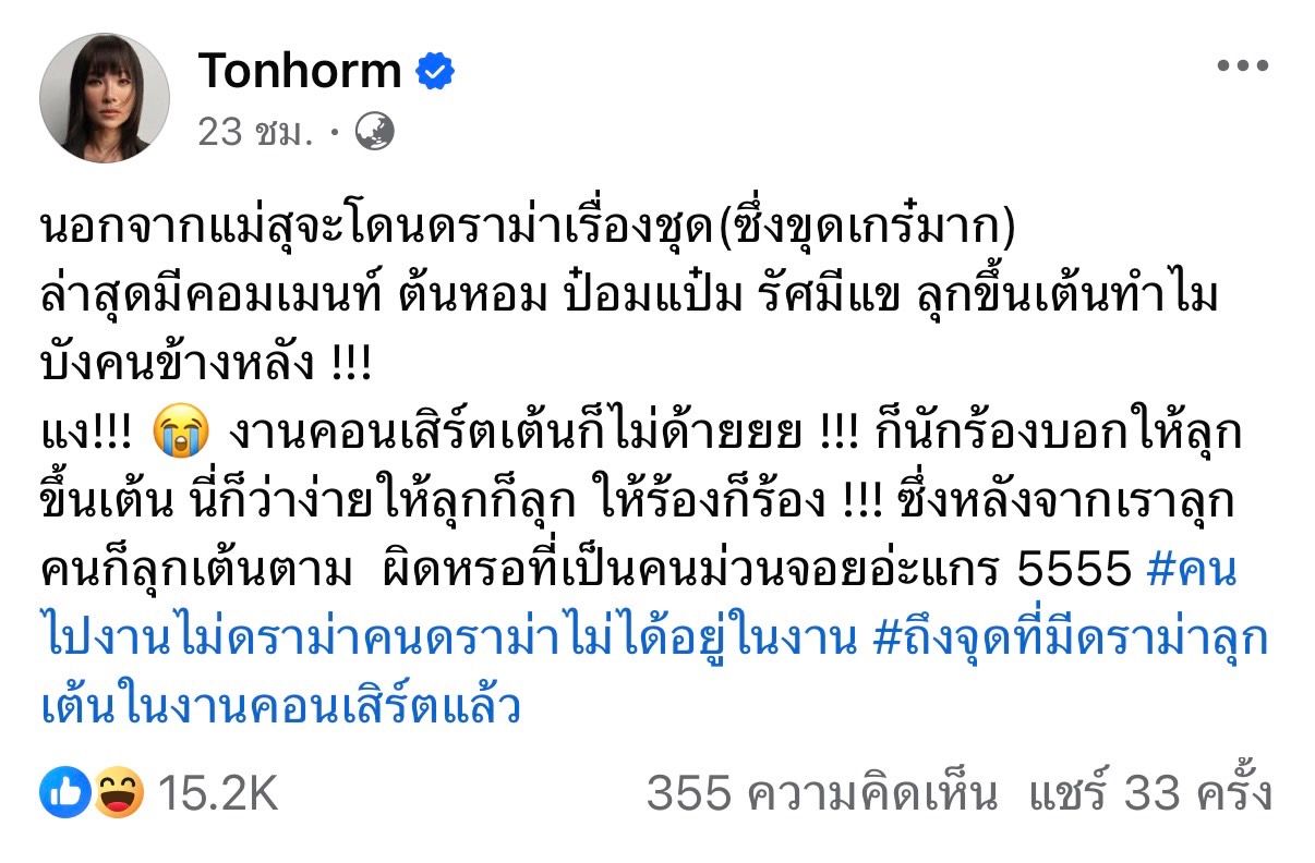 "นอกจากแม่สุจะโดนดราม่าเรื่องชุด (ซึ่งขุดเกร๋มาก) ล่าสุดมีคอมเมนต์ ต้นหอม ป๋อมแป๋ม รัศมีแข ลุกขึ้นเต้นทำไม บังคนข้างหลัง !!! แง!!! งานคอนเสิร์ตเต้นก็ไม่ด้ายยย !!! ก็นักร้องบอกให้ลุกขึ้นเต้น นี่ก็ว่าง่ายให้ลุกก็ลุก ให้ร้องก็ร้อง !!! ซึ่งหลังจากเราลุก คนก็ลุกเต้นตาม ผิดหรอที่เป็นคนม่วนจอยอ่ะแกร 5555 #คนไปงานไม่ดราม่าคนดราม่าไม่ได้อยู่ในงาน #ถึงจุดที่มีดราม่าลุกเต้นในงานคอนเสิร์ตแล้ว"
