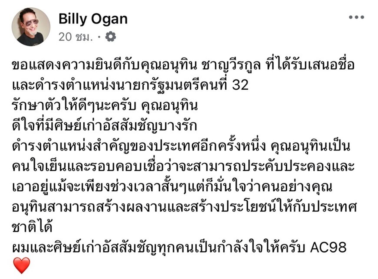 เรียกว่าเป็นอีกหนึ่งเสียงของคนในวงการบันเทิง ที่ได้ออกมาร่วมแสดงความยินดีกับ นายอนุทิน ชาญวีรกูล ที่ได้เป็นนายกรัฐมนตรี คนที่ 32 ของประเทศไทย สำหรับนักร้องรุ่นใหญ่ บิลลี่ โอแกน ที่ได้ออกมาโพสต์ข้อความผ่านเฟซบุ๊ก Billy Ogan ร่วมแสดงความยินดีกับ อนุทิน ในฐานะศิษย์เก่าของโรงเรียนอัสสัมชัญ บางรัก ด้วยกัน พร้อมกับเผยลักษณะนิสัยที่แท้จริงของ อนุทิน บอกว่า