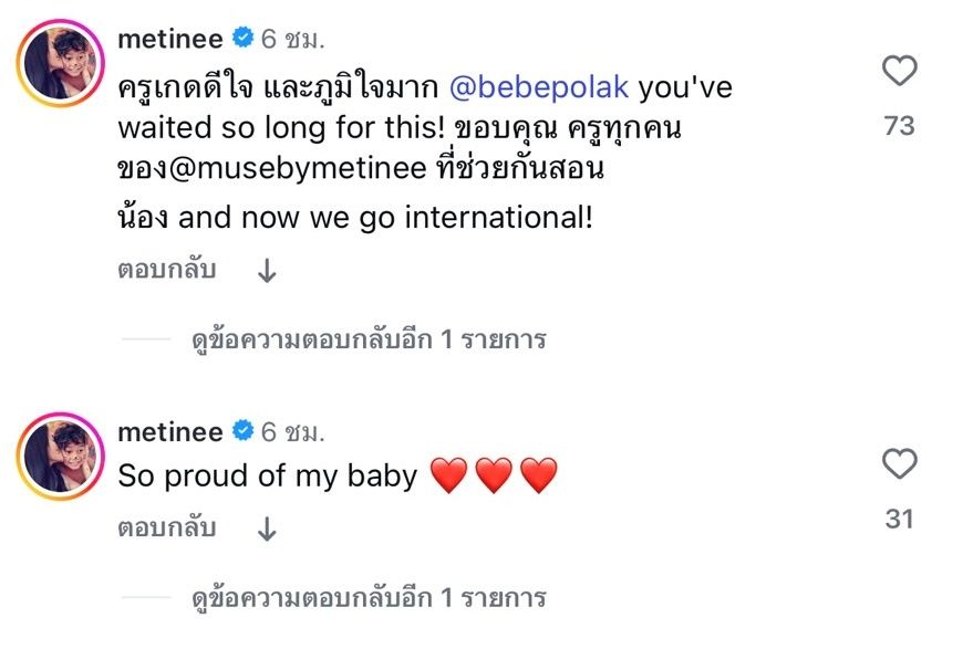 หลังจากนั้น ลูกเกด เมทินี คอมเมนต์ใต้โพสต์ไว้ว่า “So proud of my baby” และ “ครูเกดดีใจ และภูมิใจมาก @bebepolak you've waited so long for this! ขอบคุณ ครูทุกคนของ@musebymetinee ที่ช่วยกันสอน น้อง and now we go international!”