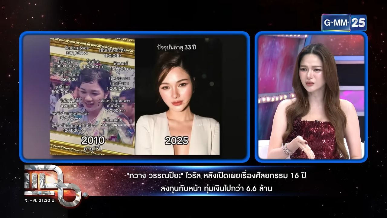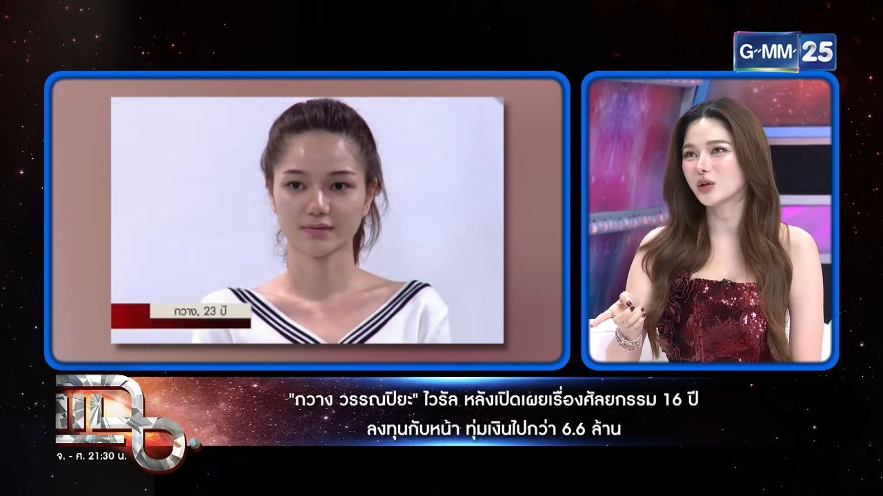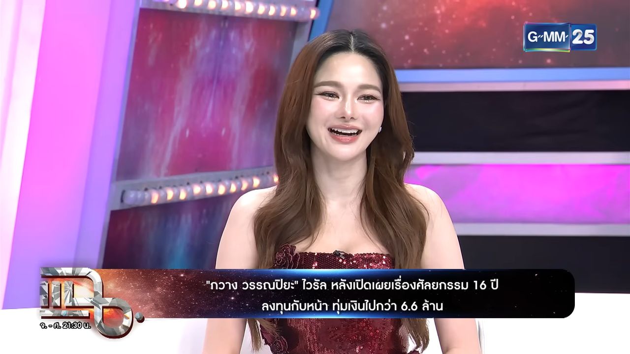 หลังจากที่นักแสดง-นางแบบสาว กวาง วรรณปิยะ ออมสินนพกุล หรือ กวาง เดอะเฟซ เปิดเผยว่าทำหน้ามานาน 16 ปี และทำไปเยอะมาก หมดเงินไปหลายล้านบาท จนกลายเป็นไวรัล ล่าสุดกวางเล่าละเอียดถึงเรื่องนี้ในรายการ “แฉ” ทางช่อง GMM25 โดยมี มดดำ คชาภา, น็อต วรฤทธิ์, เอมมี่ มรกต เป็นพิธีกร
