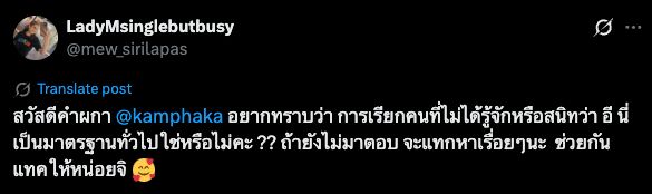 และล่าสุด หมิว ก็ได้ออกมาโพสต์ข้อความผ่าน X ซึ่งมีข้อความว่า “สวัสดีคำผกา @kamphaka อยากทราบว่า การเรียกคนที่ไม่ได้รู้จัก หรือสนิทว่า อี นี่เป็นมาตราฐานทั่วไปใช่หรือไม่คะ?? ถ้ายังไม่ตอบ จะแท็กหาเรื่อยๆ นะ ช่วยกันแท็กให้หน่อยจิ”