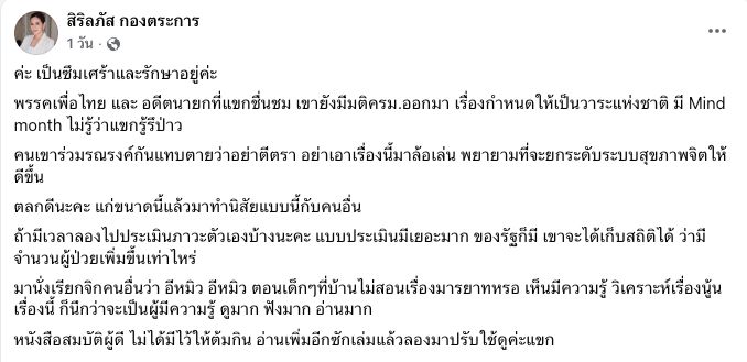 คนเขาร่วมรณรงค์กันแทบตายว่าอย่าตีตรา อย่าเอาเรื่องนี้มาล้อเล่น พยายามที่จะยกระดับระบบสุขภาพจิตให้ดีขึ้น ตลกดีนะคะ แก่ขนาดนี้แล้วมาทำนิสัยแบบนี้กับคนอื่น ถ้ามีเวลาลองไปประเมินภาวะตัวเองบ้างนะคะ แบบประเมินมีเยอะมาก ของรัฐก็มี เขาจะได้เก็บสถิติได้ ว่ามีจำนวนผู้ป่วยเพิ่มขึ้นเท่าไหร่