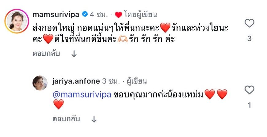 ซึ่ง นก จริยา ตอบกลับว่า “ตกใจที่เป็นกะทันหันเหมือนกันค่ะ ขอบคุณน้องอั๋นนะคะที่เทคแคร์ เดี๋ยวคุยอาการกับการดูแลจากหมอแล้วจะแชร์ให้ฟัง ดีที่รู้ว่าคนรอบตัวไม่ใช่คนแปลกหน้า จ้ะ เลิฟๆๆ จ้า”