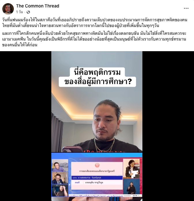 และนี้ปี 2025 แล้ว การสื่อสารที่ทำให้มีการแปะป้ายตีตรามันจะทำให้คนไม่กล้าไปปรึกษาสุขภาพจิต มันจะทำให้ผู้ป่วยได้รับการรักษาช้าลง ผมไม่แน่ใจว่าคุณคำผการู้มั้ยว่าโรคซึมเศร้าไม่แบ่งแยกพรรคการเมือง ไม่แบ่งแยกอุดมการณ์ทางการเมือง โรคซึมเศร้าไม่แบ่งแยกว่าคุณจะสีผิวไหน เชื้อชาติอะไร ทุกคนได้รับความทุกข์ทรมานจากโรคนี้อย่างเท่าเทียมกัน