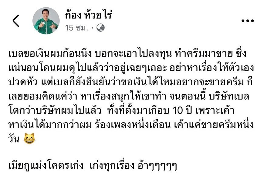 "เบลขอเงินผมก้อนหนึ่ง บอกจะเอาไปลงทุน ทำครีมมาขาย ซึ่งแน่นอนโดนผมดุไปแล้วว่าอยู่เฉย ๆ เถอะ อย่าหาเรื่องให้ตัวเองปวดหัว แต่เบลก็ยังยืนยันว่าขอเงินได้ไหมอยากจะขายครีม ก็เลยยอมคิดแค่ว่า หาเรื่องสนุกให้เขาทำ จนตอนนี้ บริษัทเบลโตกว่าบริษัทผมไปแล้ว ทั้งที่ตั้งมาเกือบ 10 ปี เพราะเขาหาเงินได้มากกว่าผม ร้องเพลงหนึ่งเดือน เขาแค่ขายครีมหนึ่งวัน เมียกูแม่งโคตรเก่ง เก่งทุกเรื่อง อ้าๆๆๆๆๆ"