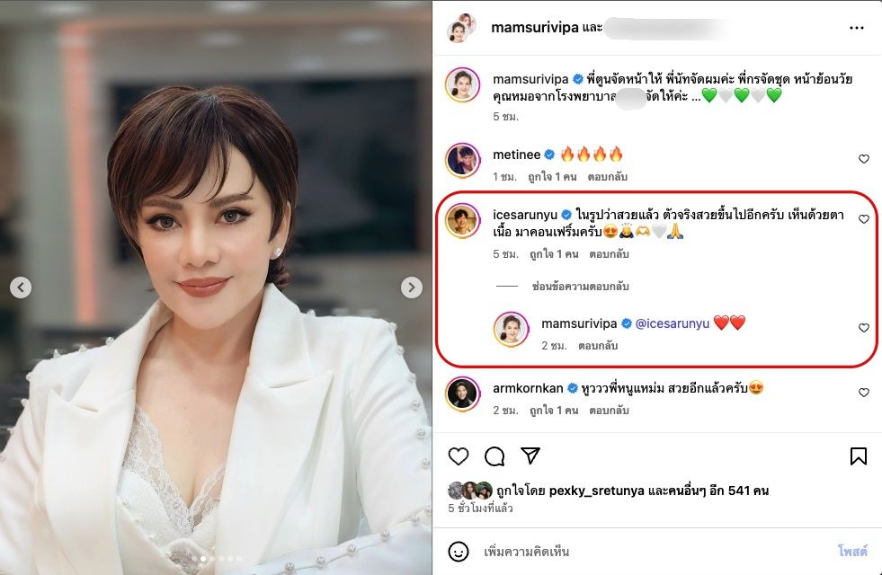 ด้านนักร้องหนุ่ม ไอซ์ ศรัณยู วินัยพานิช ก็เข้ามาคอนเฟิร์มความสวย โดยบอกว่า “ในรูปว่าสวยแล้ว ตัวจริงสวยขึ้นไปอีกครับ เห็นด้วยตาเนื้อ มาคอนเฟิร์มครับ” และหนูแหม่มก็คอมเมนต์ตอบกลับเป็นอีโมจิหัวใจด้วย