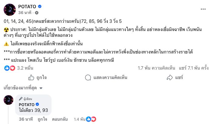 ซึ่งเลขเด็ดประจำงวดวันที่ 16 กันยายน 2568 เพจโปเตโต้ก็ได้โพสต์ข้อความว่า "01, 14, 24, 45 (กดแชร์สะดวกกว่านะครับ) 72, 85, 96 วิ่ง 3 วิ่ง 5"
