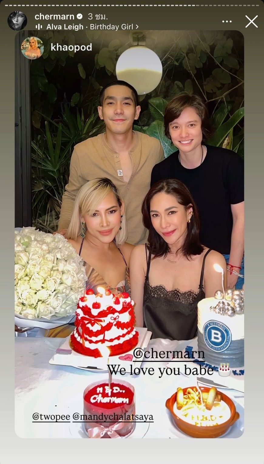 ซึ่งในไอจีสตอรี่ @chermarn พลอย เฌอมาลย์ ก็ได้รีโพสต์ภาพและคลิปอวยพรวันเกิดจากเพื่อนๆ ที่ส่งเข้ามามากมาย อีกทั้งยังรีโพสต์ภาพและคลิปที่เพื่อนๆ ทำเซอร์ไพรส์วันเกิด ขนเค้กมาให้เจ้าตัวได้เป่าหลายก้อนเลยทีเดียว