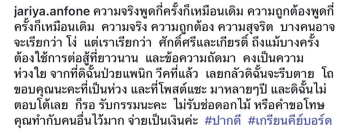 และข้อความถัดมา คงเป็นความห่วงใย จากที่ดิฉันป่วยแพนิก วีคที่แล้ว เลยกลัวดิฉันจะรีบตาย โถ ขอบคุณนะคะที่เป็นห่วง และที่โพสต์แซะ มาหลายๆ ปี และดิฉันไม่ตอบโต้เลย ก็รอรับกรรมนะคะ ไม่รับช่อดอกไม้ หรือคำขอโทษ คุณทำกับคนอื่นไว้มาก จ่ายเป็นเงินค่ะ #ปากดี #เกรียนคีย์บอร์ด"