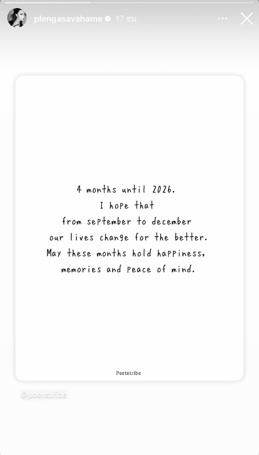 ซึ่งมีความหมายว่า “อีก 4 เดือนจนถึงปี 2026 ฉันหวังว่าจากเดือนกันยายนถึงเดือนธันวาคม ชีวิตของเราจะเปลี่ยนไปในทางที่ดีขึ้น ขอให้เดือนเหล่านี้เต็มไปด้วยความสุข ความทรงจำ และความสงบของใจ”