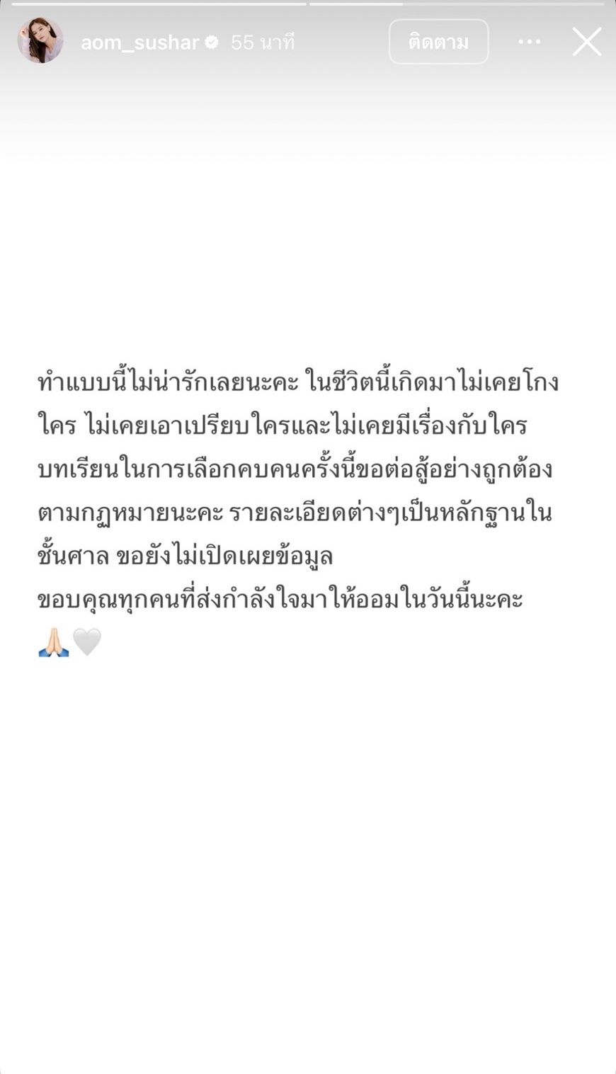 หลังจากนั้น ออม สุชาร์ ก็ได้โพสต์ข้อความลงในไอจีสตอรี่ว่า “ทําแบบนี้ไม่น่ารักเลยนะคะ ในชีวิตนี้เกิดมาไม่เคยโกงใคร ไม่เคยเอาเปรียบใครและไม่เคยมีเรื่องกับใคร บทเรียนในการเลือกคบคนครั้งนี้ขอต่อสู้อย่างถูกต้องตามกฎหมายนะคะ รายละเอียดต่างๆ เป็นหลักฐานในชั้นศาล ขอยังไม่เปิดเผยข้อมูล ขอบคุณทุกคนที่ส่งกําลังใจมาให้ออมในวันนี้นะคะ”