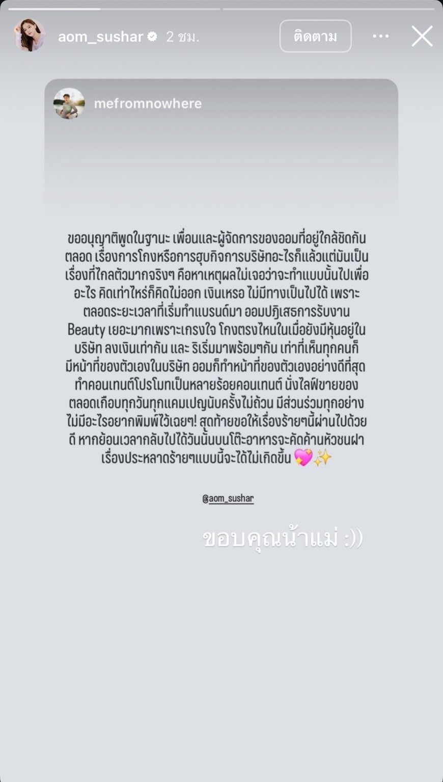 ล่าสุด ออม สุชาร์ เคลื่อนไหวถึงเรื่องนี้ด้วยการรีโพสต์ข้อความจากผู้จัดการส่วนตัวลงไอจีสตอรี่ มีเนื้อหาว่า “ขออนุญาตพูดในฐานะเพื่อนและผู้จัดการของออมที่อยู่ใกล้ชิดกันตลอด เรื่องการโกงหรือการฮุบกิจการบริษัทอะไรก็แล้วแต่มันเป็นเรื่องที่ไกลตัวมากจริงๆ