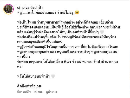 รักพ่อมากๆ นะคะ ไม่ใช่แค่เจี๊ยบ พี่เจ๋ง จ๋า แม่ พวกเรารักปาป๋ามากๆ นะคะ หลับให้สบายบนฟ้าน้า คิดถึงเท่าฟ้าเลย"