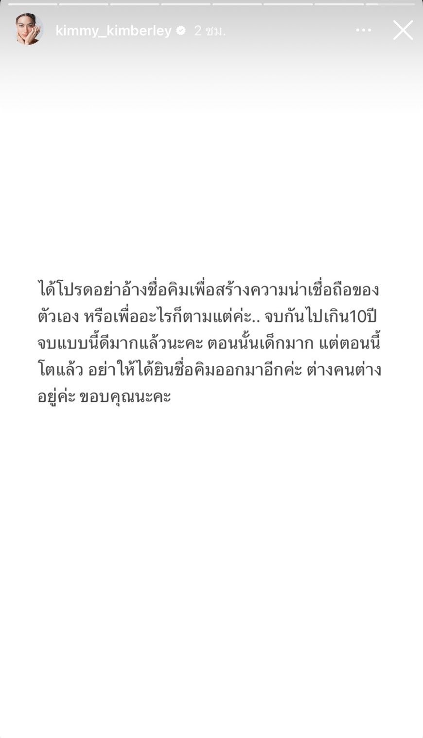 โดยคิมเบอร์ลี่ได้โพสต์ลงไอจีสตอรี่ @kimmy_kimberley ซึ่งมีเนื้อหาว่า “ได้โปรดอย่าอ้างชื่อคิมเพื่อสร้างความน่าเชื่อถือของตัวเอง หรือเพื่ออะไรก็ตามแต่ค่ะ..จบกันไปเกิน 10 ปี จบแบบนี้ดีมากแล้วนะคะ ตอนนั้นเด็กมาก แต่ตอนนี้โตแล้ว อย่าให้ได้ยินชื่อคิมออกมาอีกค่ะ ต่างคนต่างอยู่ค่ะ ขอบคุณนะคะ”