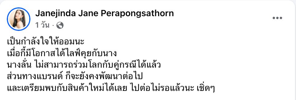 "เป็นกำลังใจให้ออมนะ เมื่อกี้มีโอกาสได้ไลฟ์คุยกับนาง นางลั่น ไม่สามารถร่วมโลกกับคู่กรณีได้แล้ว ส่วนทางแบรนด์ ก็จะยังคงพัฒนาต่อไป และเตรียมพบกับสินค้าใหม่ได้เลย ไปต่อไม่รอแล้วนะ เชิ่ดๆ"