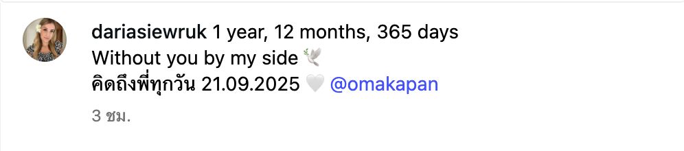แต่ถึงแม้ อ๋อม จะจากไป แต่ดาเรียก็มักจะโพสต์ข้อความถึงสามีของตัวเองอยู่เสมอ และล่าสุด ดาเรียได้โพสต์รูปกับสามียืนกอดกันที่ชายหาด พร้อมเขียนข้อความเอาไว้ว่า "1 year, 12 months, 365 days Without you by my side คิดถึงพี่ทุกวัน 21.09.2025 @omakapan" (1 ปี 12 เดือน 365 วัน ไม่มีเธออยู่เคียงข้าง คิดถึงพี่ทุกวัน 21.09.2025)