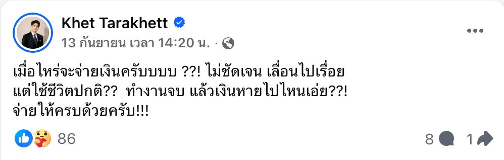 ซึ่งนักแสดงหนุ่มได้โพสต์ข้อความว่า “เงินเมื่อไหร่จะได้ครบครับ.. เลื่อนเก่งมากครับ ถ่ายจบจะ 2 ปีแล้วครับบบบบบ” และ "เมื่อไหร่จะจ่ายเงินครับบบบ ??! ไม่ชัดเจน เลื่อนไปเรื่อย แต่ใช้ชีวิตปกติ?? ทำงานจบ แล้วเงินหายไปไหนเอ่ย??! จ่ายให้ครบด้วยครับ!!!"