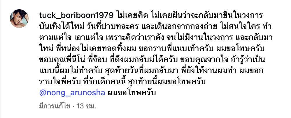 พี่หน่องไม่เคยทอดทิ้งผม ขอกราบพี่แนบเท้าครับ ผมขอโทษครับ ขอบคุณพี่นีโน่ พี่จ๊อบ ที่ดึงผมกลับมาได้ครับ ขอบคุณจากใจ ถ้ารู้ว่าเป็นแบบนี้ผมไม่ทำครับ สุดท้ายวันที่ผมกลับมา พี่ยังให้งานผมทำ ผมขอกราบใจพี่ครับ ที่รักเด็กคนนี้ สุดท้ายนี้ผมขอโทษครับ @nong_arunosha ผมขอโทษครับ"
