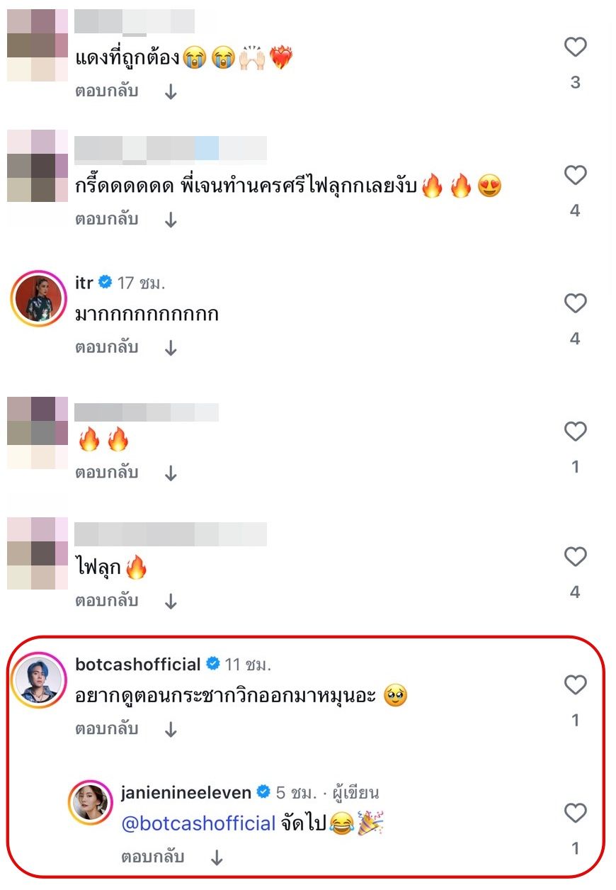 ส่องคอมเมนต์ก็มีเพื่อนๆ แฟนๆ ส่งอีโมจิไฟลุกและแสดงความคิดเห็นกันเพียบ อาทิ ผมยาวปุ๊บเซ็กซี่มาเลอๆๆๆ ค่า, แดงที่ถูกต้อง, กรี๊ดดดดดด พี่เจนทำนครศรีไฟลุกกเลยงับ, มากกกกกกกกกก, ไฟลุก, สวยมากค่า, ซื้อลุคนี้ๆ ฯลฯ