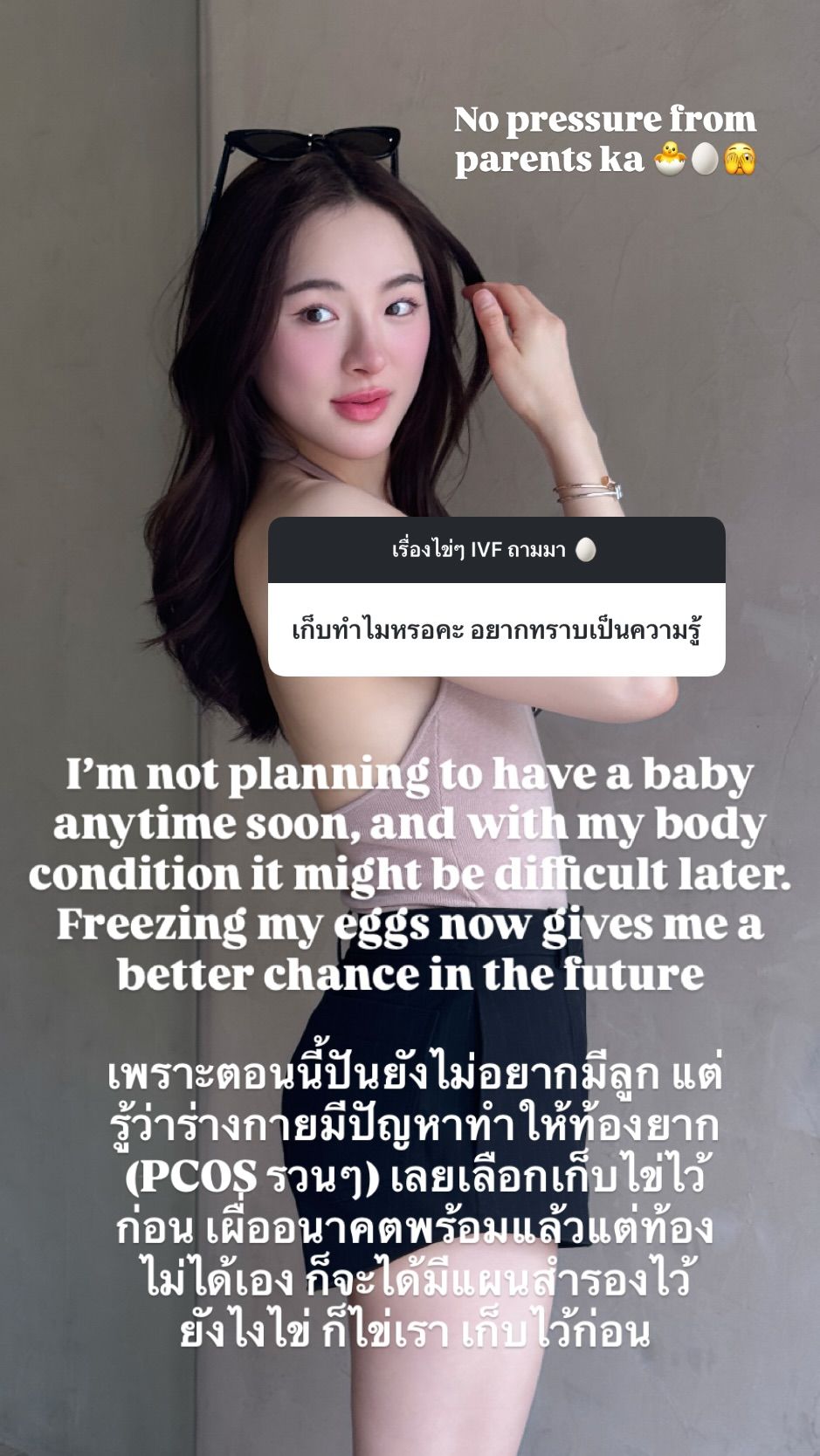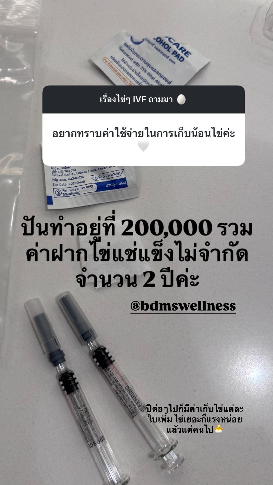 ส่วนค่าใช้จ่ายทั้งหมดเท่าไหร่ ปันปันตอบว่า “ปันทำอยู่ที่ 200,000 รวมค่าฝากไข่แช่แข็งไม่จำกัด จำนวน 2 ปี ปีต่อๆไปก็มีค่าเก็บไข่แต่ละใบเพิ่ม ไข่เยอะก็แรงหน่อย แล้วแต่คนไป”