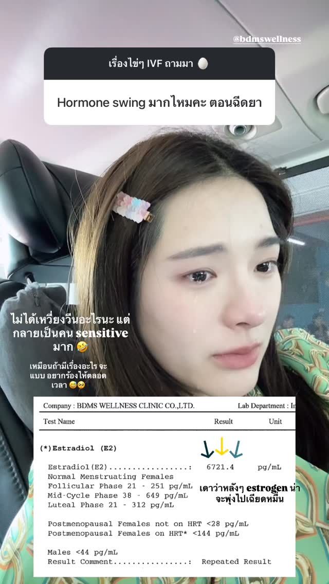 นอกจากนี้ยังมีคนถามเรื่องฮอร์โมนสวิงมากไหมตอนฉีดยา ปันปันตอบคำถามด้วยการโพสต์คลิปนั่งน้ำตาไหล พร้อมเผยว่า “ไม่ได้เหวี่ยงวีนอะไรนะ แต่กลายเป็นคน sensitive มาก เหมือนถ้ามีเรื่องอะไร จะแบบอยากร้องไห้ตลอดเวลา เดาว่าหลังๆ estrogen น่าจะพุ่งไปเฉียดหมื่น”